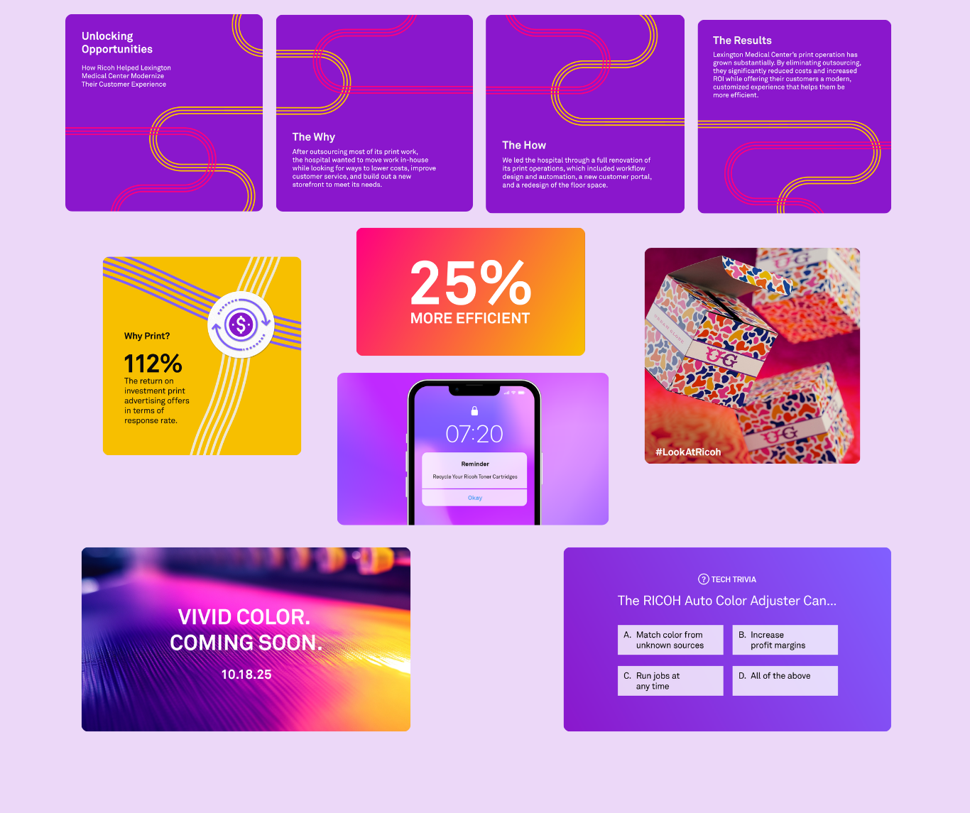 We crafted strategic, copy-led social content designed to position Ricoh as a trusted thought leader in the print and graphic communications space. Messaging focused on practical applications, thought leadership, actionable insights for print professionals, and real-world impact—all aligned with Ricoh’s professional, solutions-driven voice. Every post was developed with clarity and credibility at the forefront, ensuring consistency across channels.